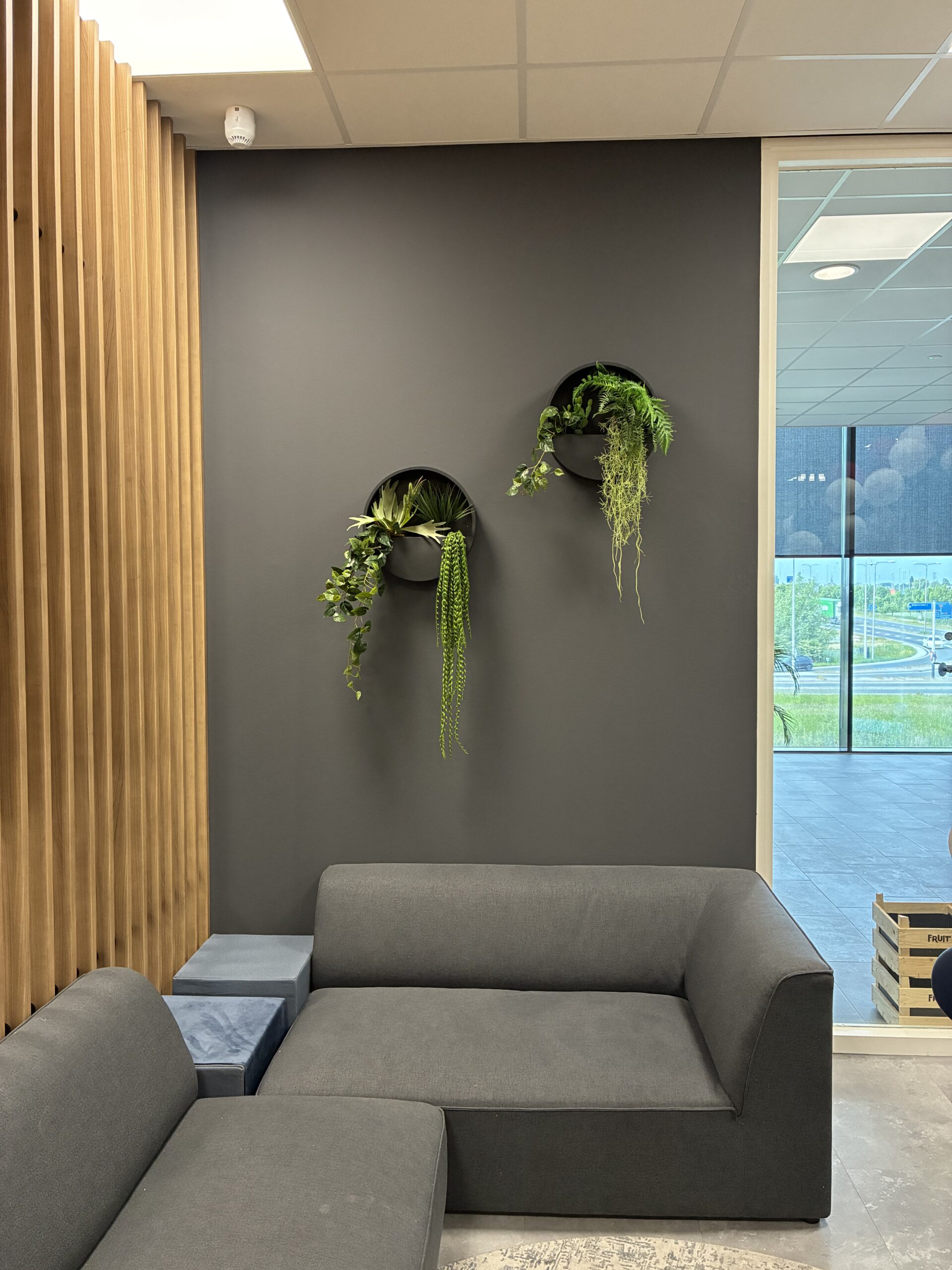 Realisatie van meerdere moswanden, die niet alleen een eyecatcher vormen maar ook bijdragen aan een betere akoestiek.