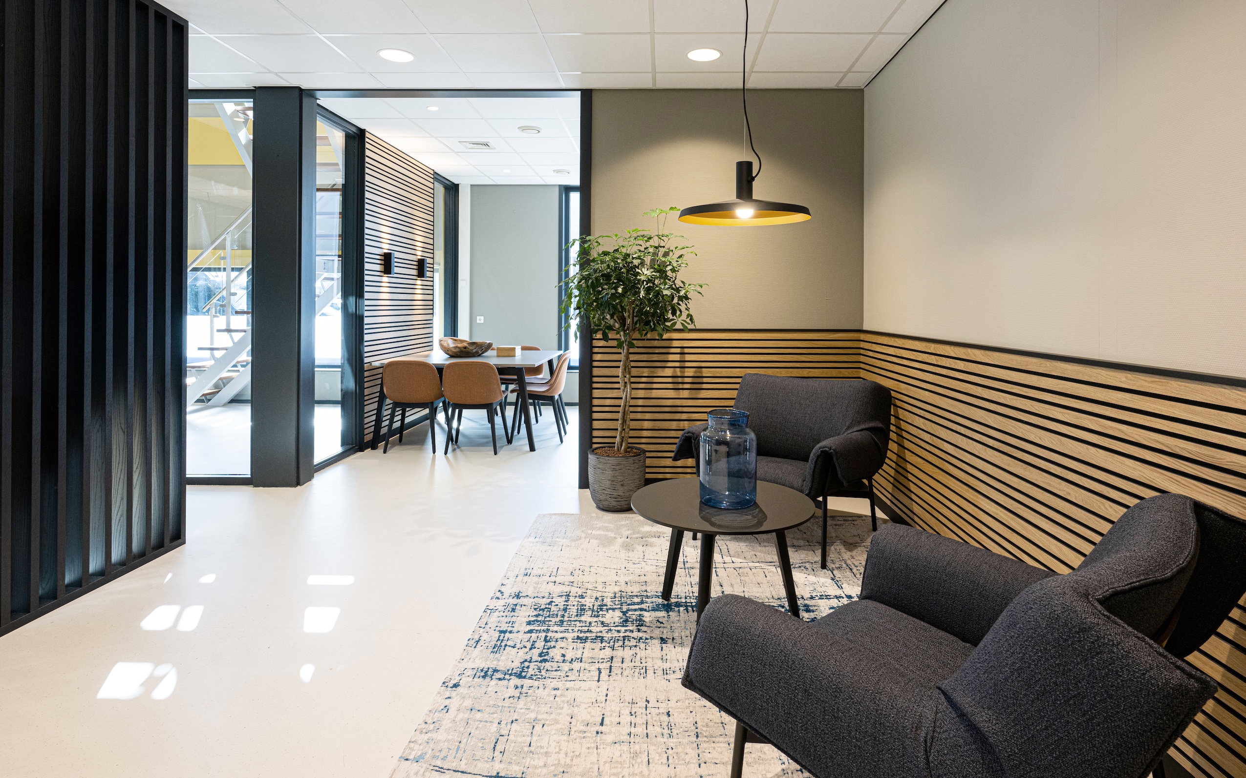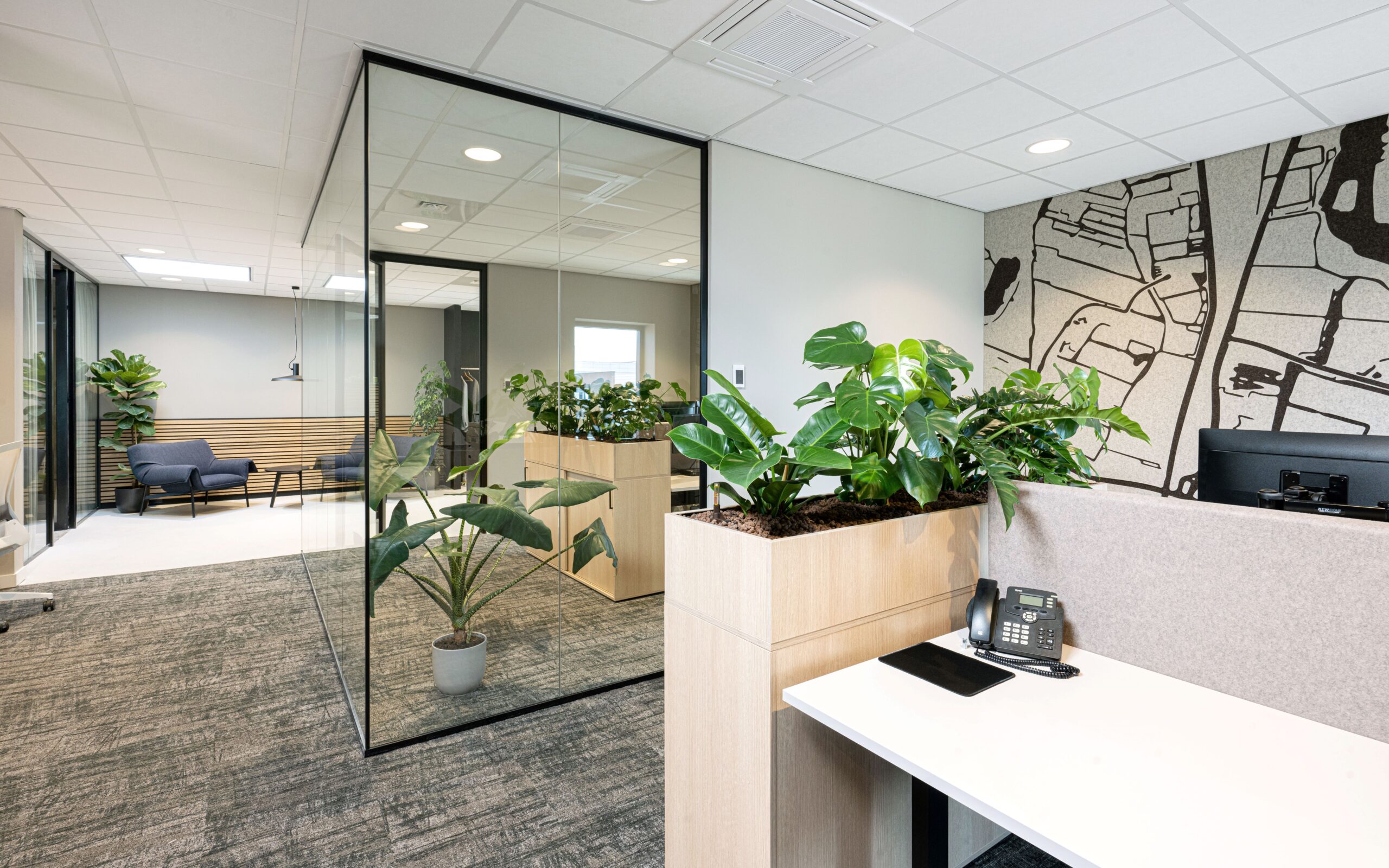 Het resultaat is een inspirerend kantoorinterieur waarin groen zorgt voor rust, privacy en een natuurlijke balans, perfect passend bij de professionele uitstraling van Zaannotarissen.